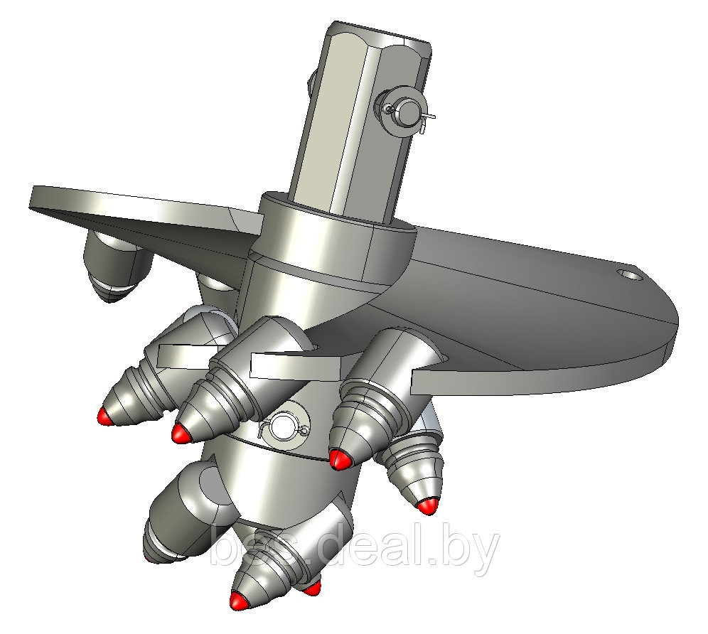 Конусный бур Б-02703 предназначен для бурения скальных пород. Корпус бура стальной сварной, резцы круглые сменные. Особенностью бура Б-02703 является пилот-забурник, изготовленный из цельнолитой стальной болванки путем фрезерования. На режущей кромке этого бура размещаются резцы относительно большого размера, способные передавать на породу высокое разрушительное усилие.