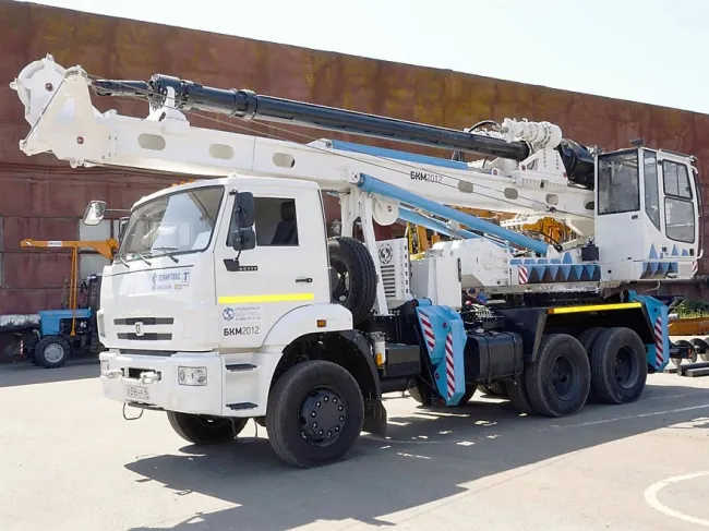 Бурильно-крановая машина БКМ-2012 предназначена для бурения скважин в не мёрзлых, с сезонным промерзанием и вечномёрзлых грунтах I-IV категорий в промышленном и гражданском строительстве. Бурильно-крановая машина БКМ-2012 продолжает ряд выпускаемых машин с глубиной бурения до 15 м и предлагается для их замены. Бурильно-крановая машина БКМ-2012 оснащена поворотной платформой, предусмотрено продольное перемещение бурильно-кранового оборудования, отопляемая кабина оператора. Тип основного бурового инструмента короткошнековый бур, может комплектоваться ковшовыми бурами. Привод вращения бурового инструмента — гидравлический. Двухпоточная гидравлическая система (для бурения и вспомагательных операций). Высокая мощность приводного двигателя гидравлической Бурильно-крановая машина БКМ-2012 улучшает эксплуатационные свойства машины. Позволяет бурить скважины и устанавливать в них опоры без переоборудования и изменения позиции. В конструкции использованы импортные комплектующие.